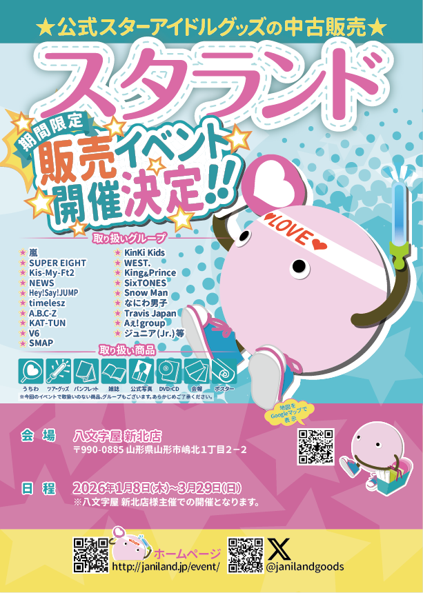 2026年1月8日(木)から3月29日(日)までの約2ヶ月半、八文字屋 北店にて公式スターアイドルグッズの中古販売イベントを開催します! 2025年1月の開催が大好評につき7回目の開催!人気商品をセレクトし、ジャニ...