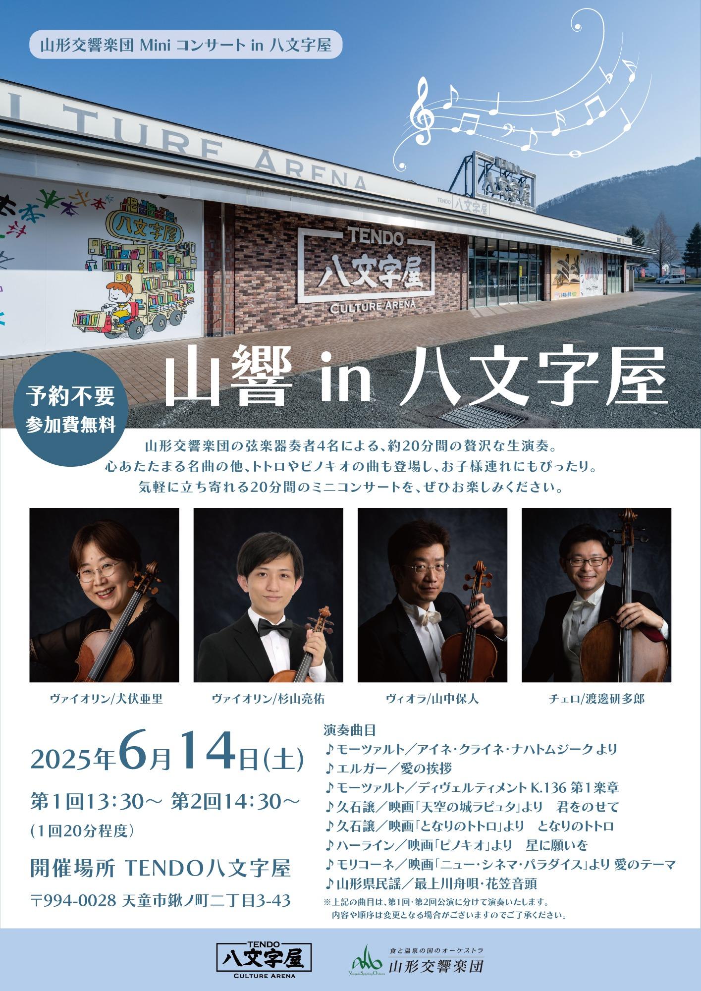 6月14日(土) TENDO 八文字屋にて「山形交響楽団 Mini コンサート in 八文字屋」を開催いたします。
