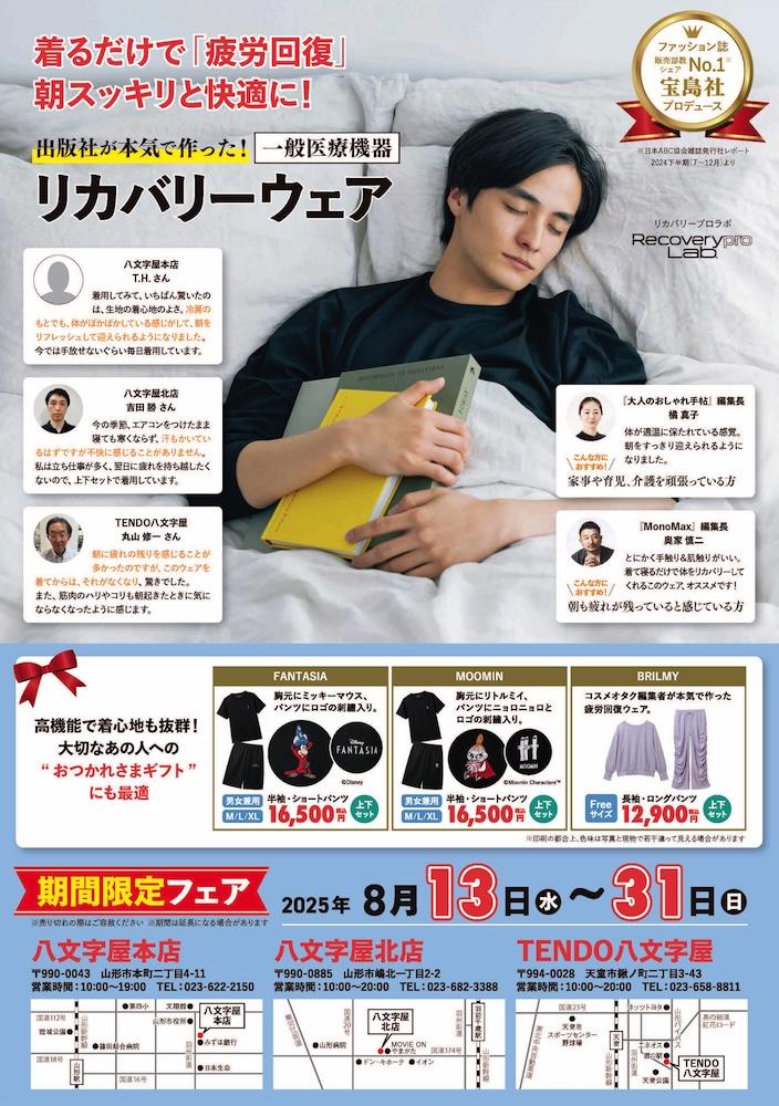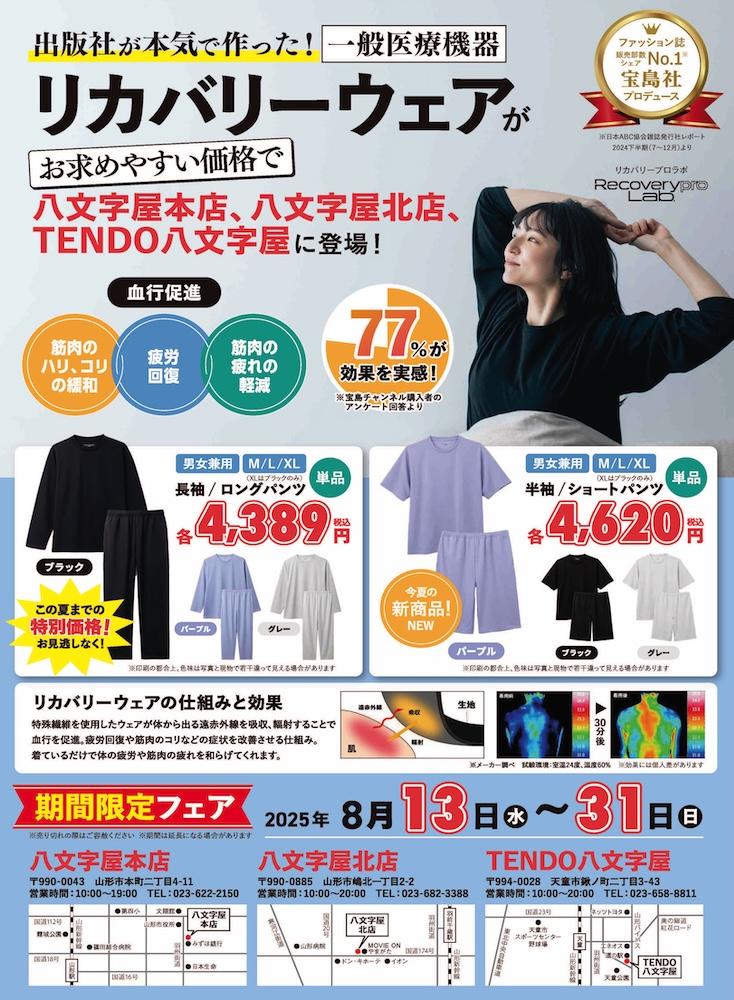 PickUp 宝島社「リカバリーウェア」フェア 2025.08.13 八文字屋ONLINE 着るだけで疲労回復!リカバリーウェア 2025年8月13日 (水) 〜31日 (日) までの期間中、八文字屋各店にて『リカバリーウェア』フェアを開催します。 『リカバリーウェア』は、特殊繊維を使用したウェアが体から出る遠赤外線を吸収、輻射することで血行を促進。 疲労回復や筋肉のコリなどの症状を改善させる仕組みです。 着ているだけで体の疲労や筋肉の疲れを和らげてくれます。 取扱い:本店、北店、天童店、鶴岡店、酒田店、新庄店、泉店 在庫状況は各店舗に直接お問い合わせください。
