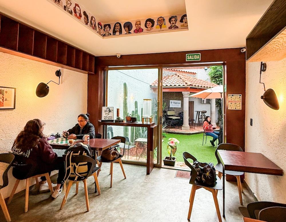 その店の外壁には、ガイコツの顔を持った修道女の下に、「Pinches Necios (忌々しい頑固男たちよ)」というフレーズが描かれたグラフィティがある。これは男の人が入り難いのでは、と思いきや、入り口付近には「私たちはメン・フレンドリーです」と表示があって、拍子抜けした。