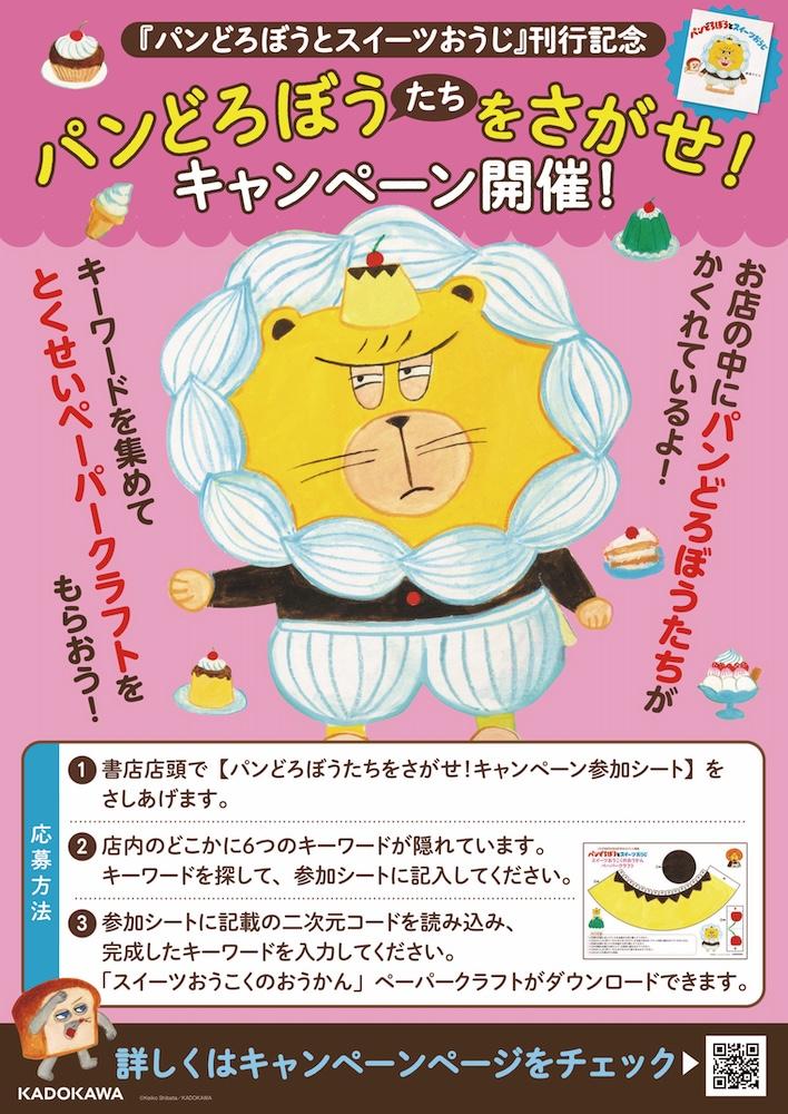 イベント ワクワク 『パンどろぼうとスイーツおうじ』刊行記念キャンペーン開催中【八文字屋 全店】 2025.09.10 八文字屋ONLINE 『パンどろぼうとスイーツおうじ』刊行記念 9月10日 (水) より、八文字屋 全店舗にて「パンどろぼうたちをさがせ!キャンペーン」を開催中です。 どなたでもお気軽にご参加いただけます。 お誘い合わせのうえ、ぜひご来店ください。 【応募方法】 ①書店店頭で【パンどろぼうたちをさがせ!キャンペーン参加シート】をさしあげます。 ②店内のどこかに6つのキーワードが隠れています。キーワードを探して、参加シートに記入してください。 ③参加シートに記載の二次元コードを読み込み、完成したキーワードを入力してください。「スイーツおうこくのおうかん」ペーパークラフトがダウンロードできます。