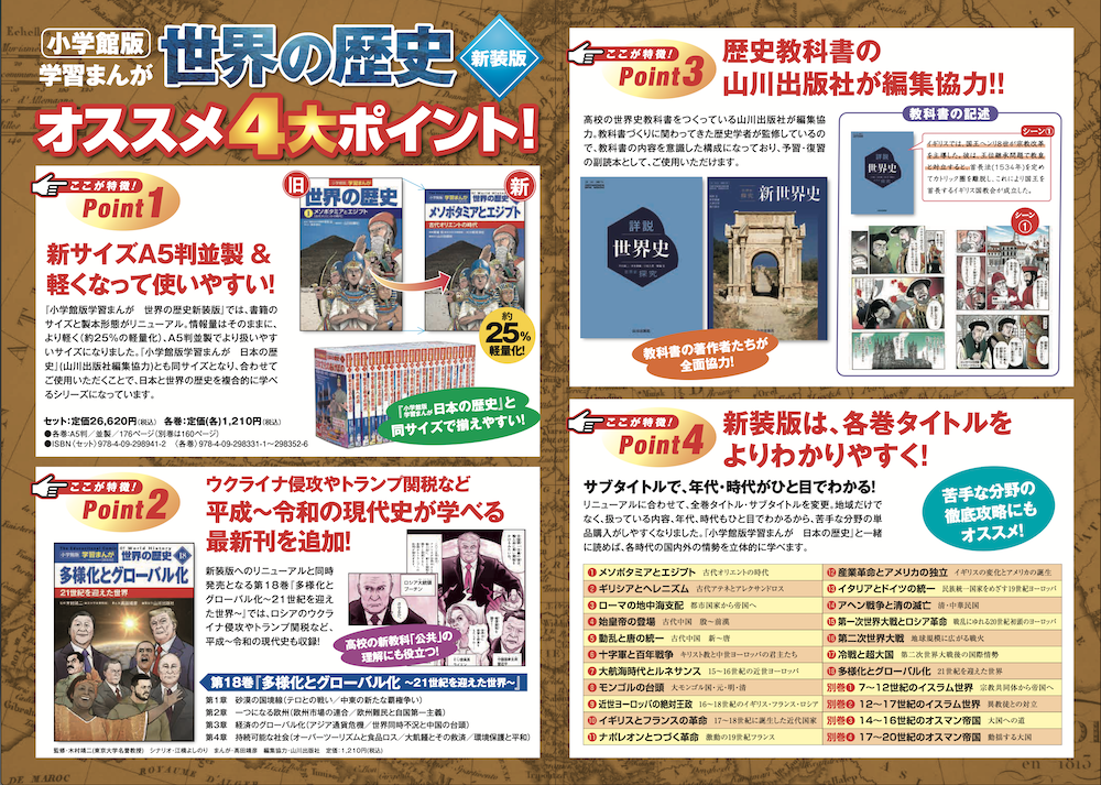 『小学館版学習まんが 日本の歴史』(山川出版社編集協力)とも同サイズとなり、合わせてご使用いただくことで、日本と世界の歴史を複合的に学べるシリーズになっています。