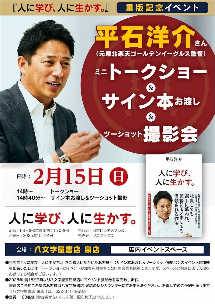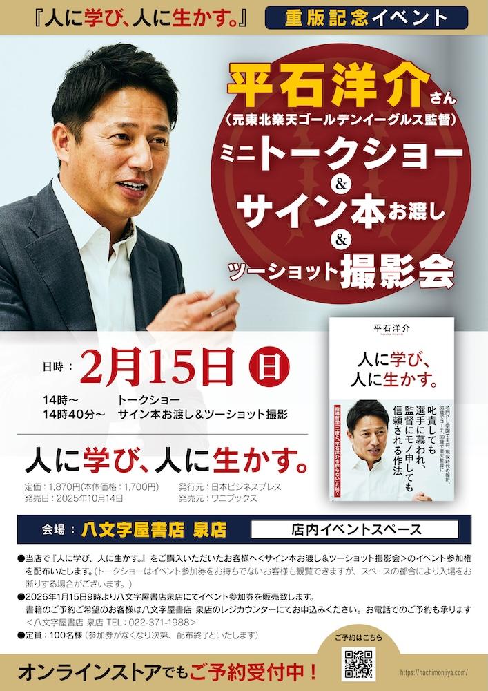 平石洋介さん(元東北楽天ゴールデンイーグルス監督)の著書『人に学び、人に生かす。』重版記念イベントを、八文字屋書店 泉店で開催します。