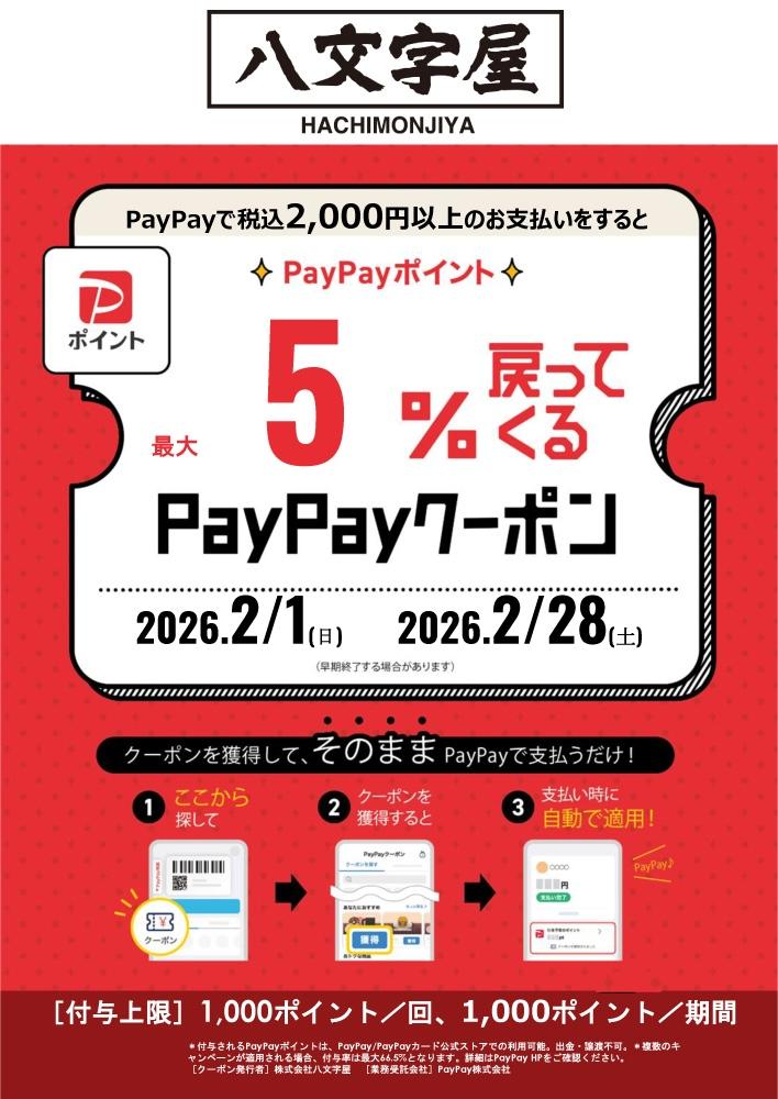 2月1日(日)より、八文字屋のお店でPayPayを利用すると最大5%(付与上限あり)戻ってくるキャンペーンがスタートします。