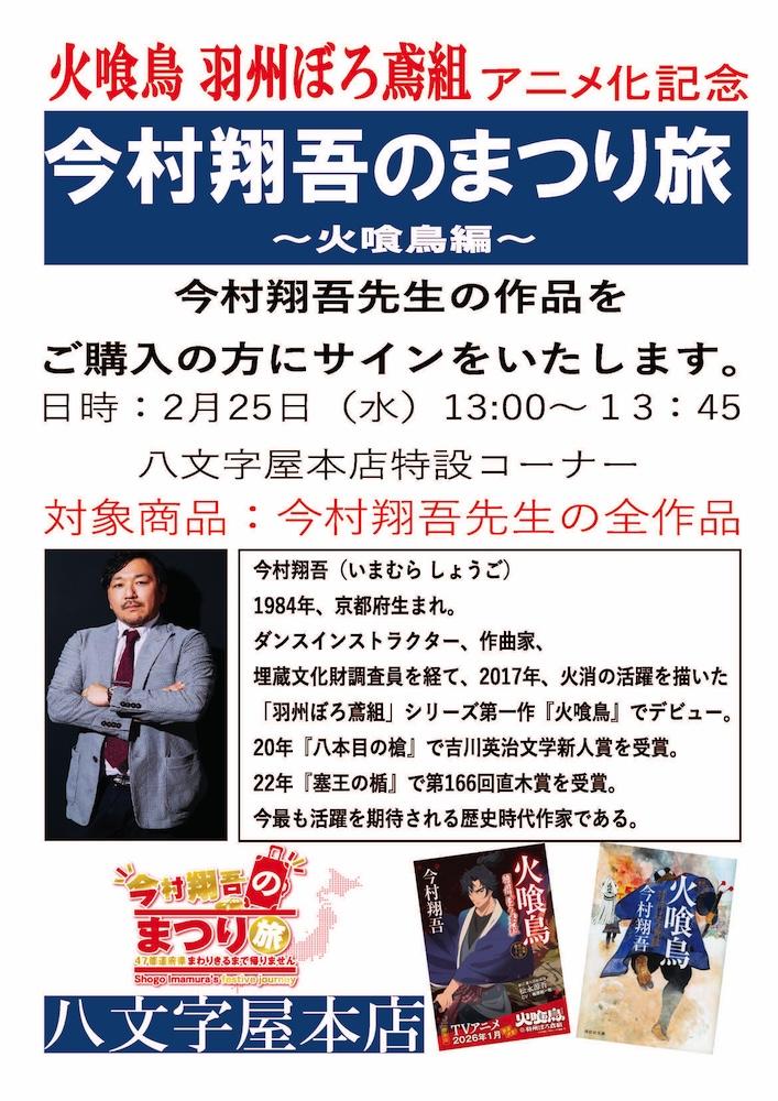 イベント お知らせ PickUp 2/25 (水) 今村翔吾先生 サイン会開催『火喰鳥 羽州ぼろ鳶組』アニメ化記念 2026.02.20 八文字屋ONLINE 2月25日(水) 八文字屋本店にて「今村翔吾先生 サイン会」を開催いたします。 江戸時代の新庄藩を舞台にした時代小説『羽州ぼろ鳶組』の魅力を、ファンの皆さまと分かち合う貴重な機会となります。 皆様のご参加を心よりお待ちしております。 開催内容 日時:2025年2月25日(水)13:00~13:45 会場:八文字屋本店 特設コーナー 〒990-0043 山形市本町二丁目4-11 参加方法 :当日、八文字屋本店にて今村翔吾先生の作品をご購入ください。