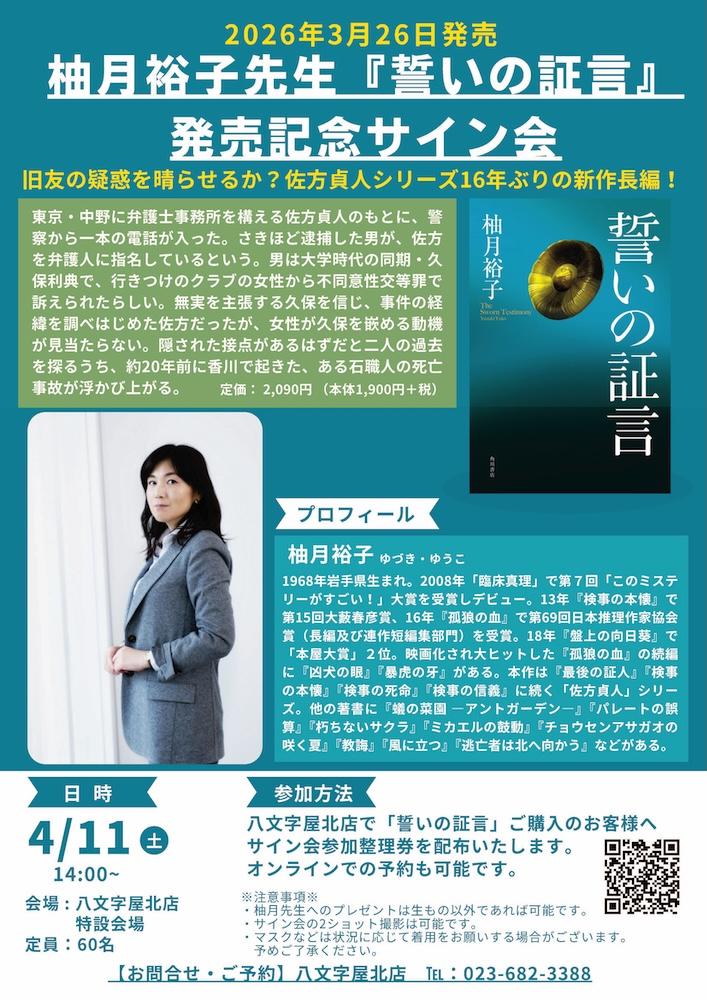 八文字屋北店で『誓いの証言』ご購入のお客様へサイン会参加整理券を配布いたします。