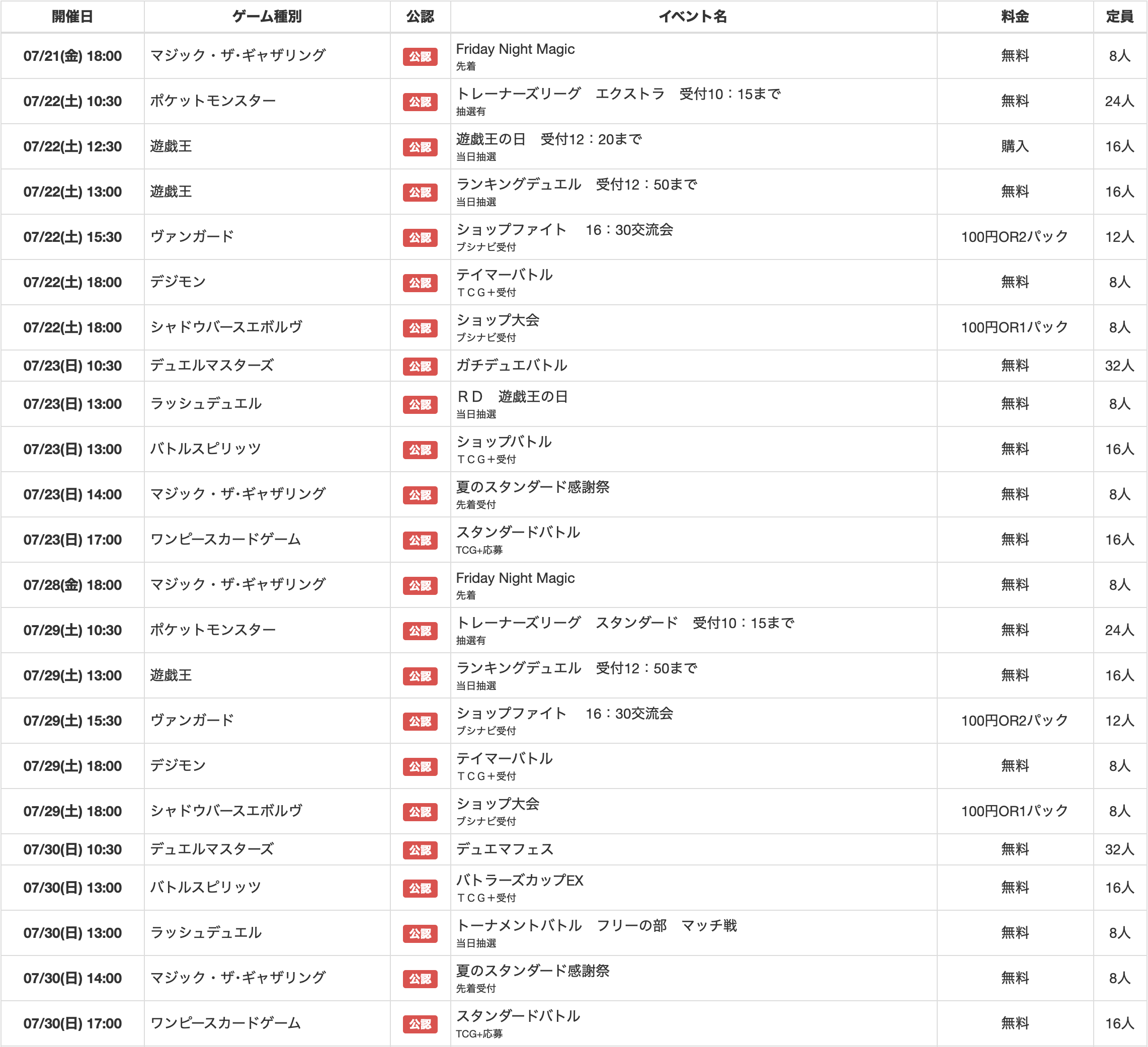 2023年7月のトレーディングカード大会情報をお知らせします。
