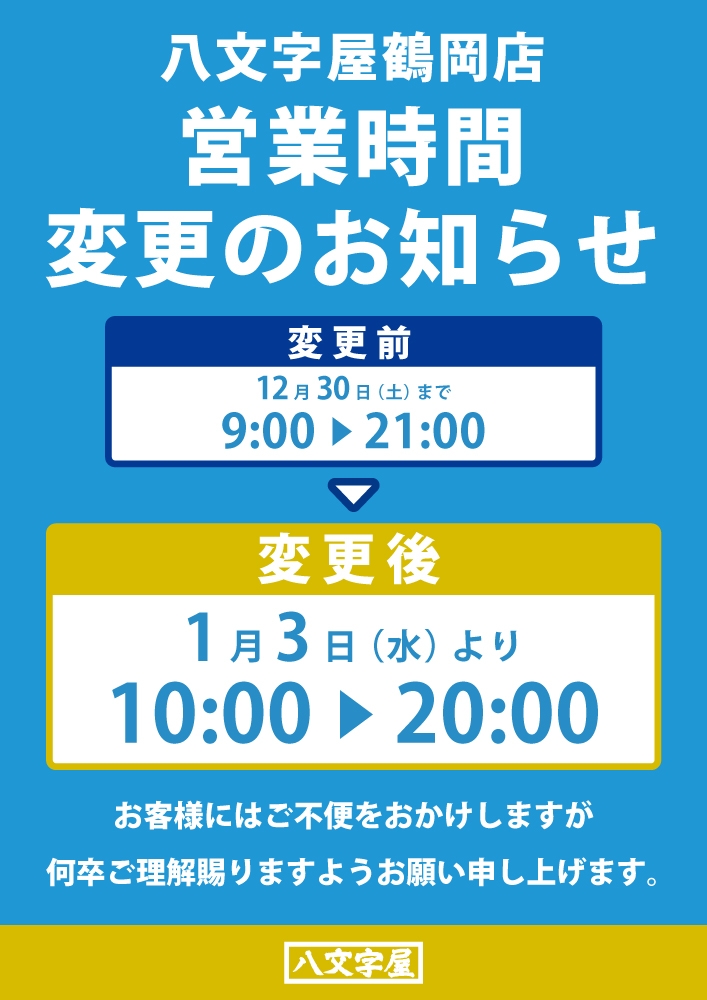 誠に勝手ではございますが、2024年1月3日(水)より、鶴岡店の営業時間が変更となります。
