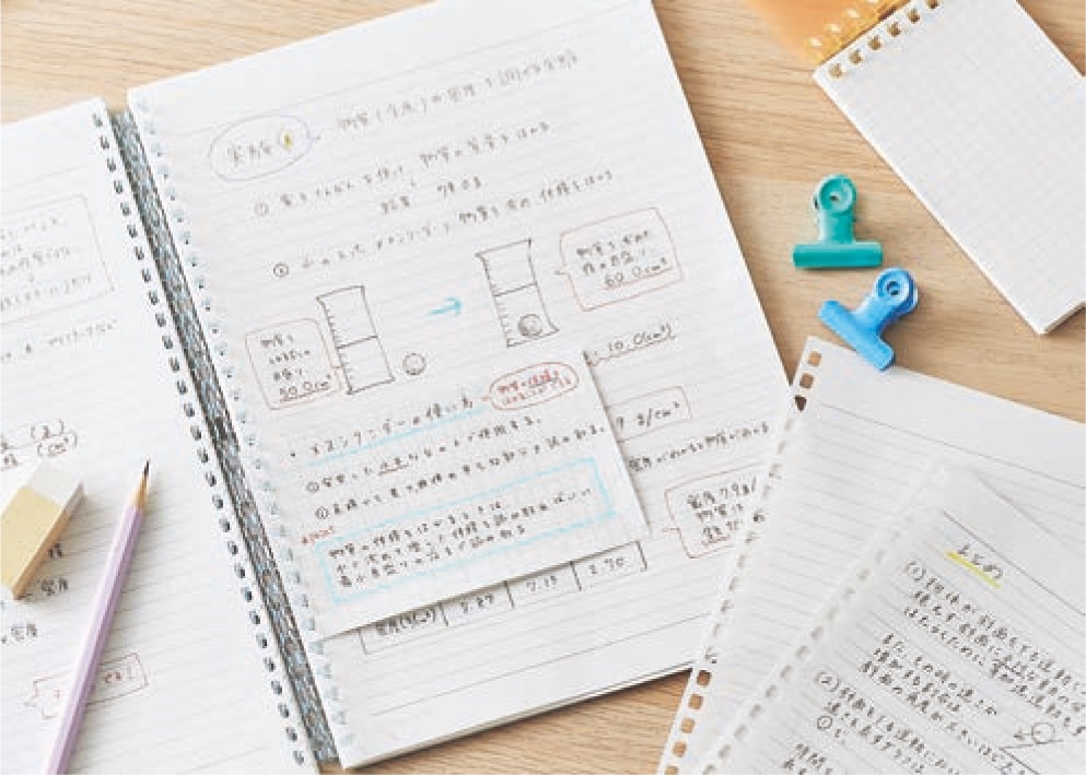 全教科の授業内容を1冊に記入。あとでリーフ を抜き差しして、それぞれの教科ごとのオープ ンリングノートに分類・整理できます。