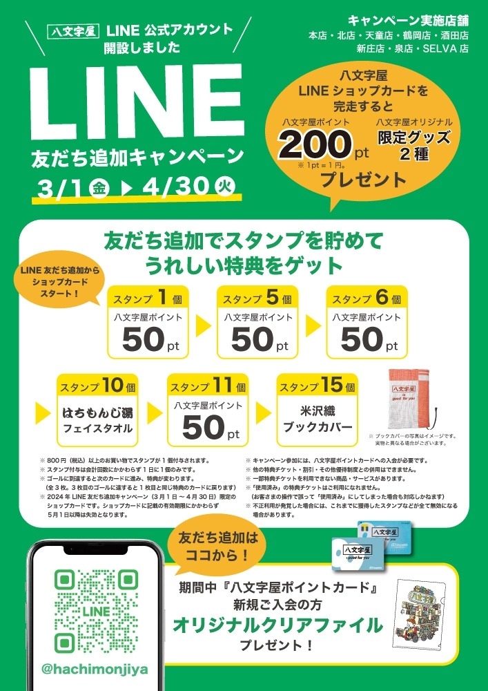 LINE公式アカウント オープンを記念し、3月1日(金)〜 4月30日(火)の期間中、八文字屋各店(長井店、こぴあ店を除く)で「LINE 友だち追加キャンペーン」を開催します。
