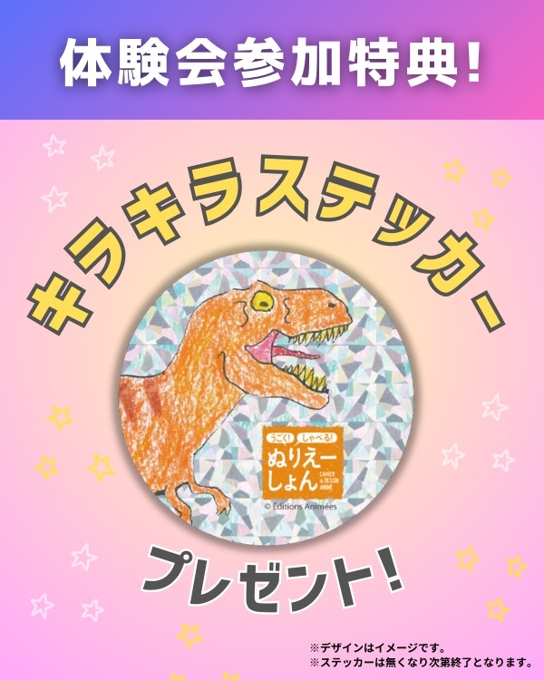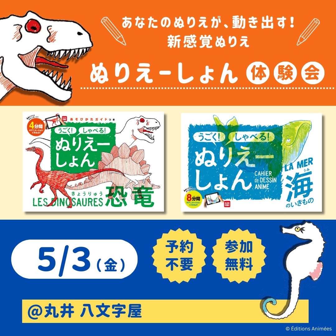 イベント ワクワク 5月3日丸井 八文字屋『うごく! しゃべる! ぬりえーしょん』体験会 2024.05.02 八文字屋ONLINE フランス生まれの新感覚ぬりえ『うごく! しゃべる! ぬりえーしょん』シリーズを無料で体験できるイベントを開催します。 自分で塗ったぬりえをアプリで読み込むと、楽しいナレーションと共に画面の中を滑らかに動きだします。 ぬりえがアニメーションになる瞬間のワクワクを、ぜひご体験ください。 参加いただいた方には「キラキラステッカー」をプレゼント! 参加無料、ご予約不要のイベントです。 どうぞお気軽にお越しください。 日時:2024年5月3日(金・祝)10:00~、13:00~(随時実施) 会場:丸井八文字屋 参加費:無料