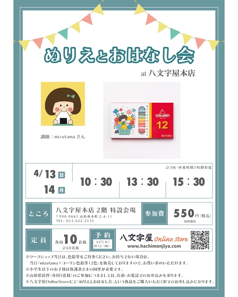 mizutamaさん 「ぬりえとおはなし会」at 八文字屋本店 ワークショップ(リンク先:八文字屋Instagram)